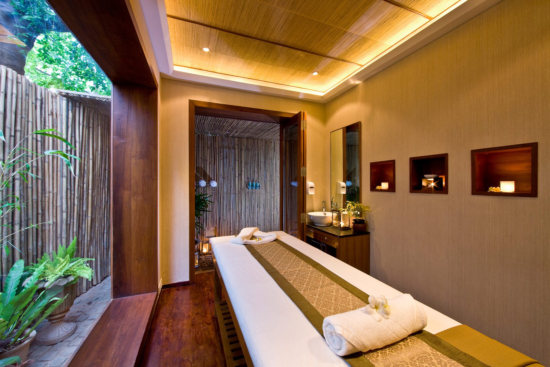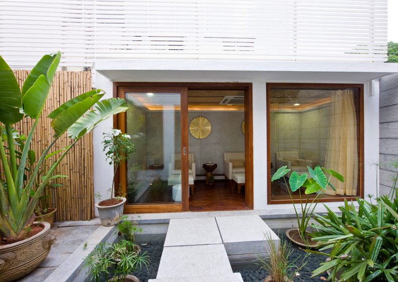 The location of the day spa is on one of Bangalore’s upmarket yet noisy shopping streets and we chose to create an inward looking tropical haven of serenity and tranquility.