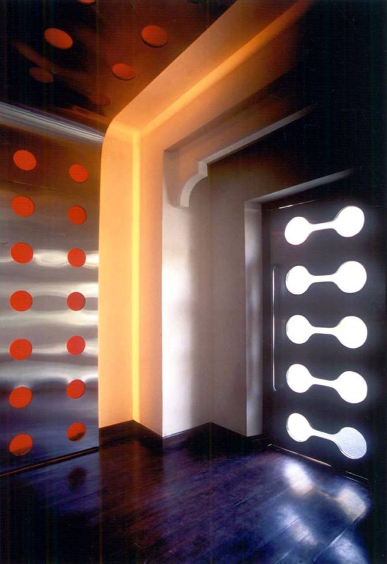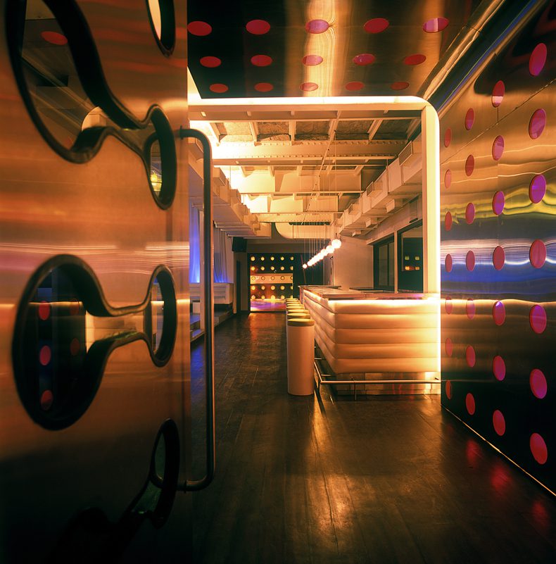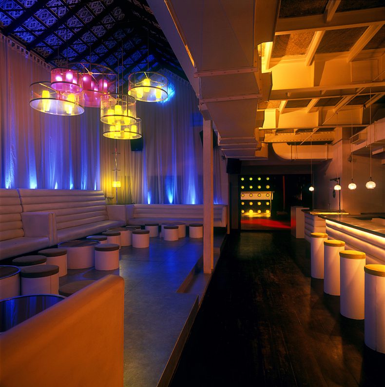 The design incorporates two strong axes. The east-west axis interlinks the three distinct moods of Spinn, the calm courtyard, the chic lounge bar and the pulsating discotheque. Along the north-south axis is the double sided bar, which spatially connects the inner and outer areas.