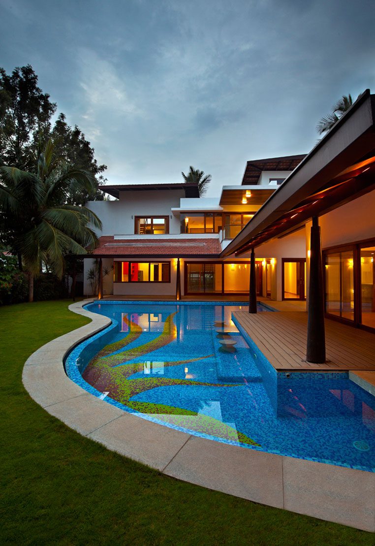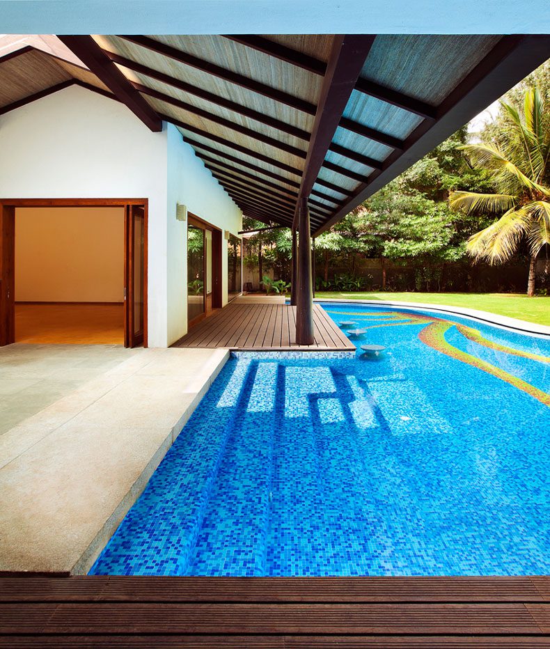 The house designed for the Architects brother, his wife and daughter, derives its form from a generous L shaped configuration that spills out to a large garden and swimming pool. Its attitude was intended to be vibrant, bright and sunny reflecting the exuberant personality of the homeowner who is a prominent Indian fashion designer.