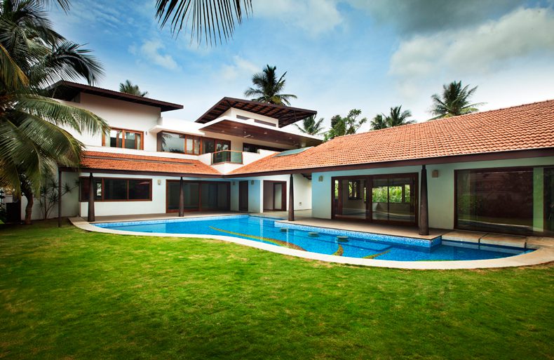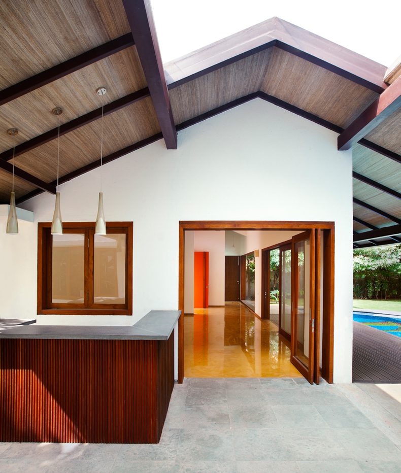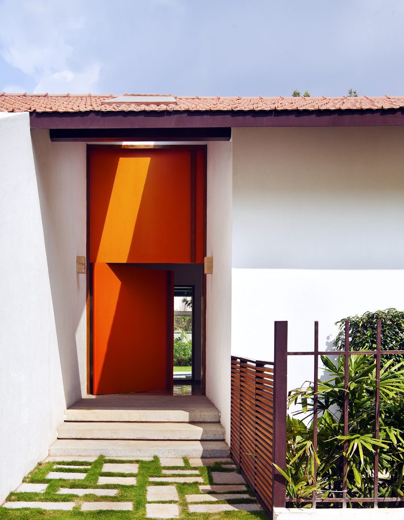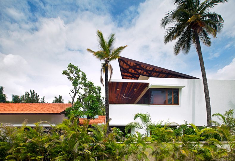 The house is climate and context sensitive. The Mangalore tiled terracotta sloping roof forms are reinterpretations if the vernacular houses in the region. The tiles and slopes combat the monsoon rains and protect the house from overheating in the summer. The east and northern faces of the house are transparent and permeable: they open to the soft morning light. Contrastingly, the western and southern facades of the house are intentionally more opaque in order to protect against the fierce west and southern sun.
