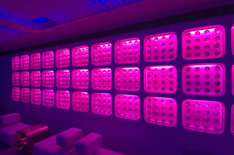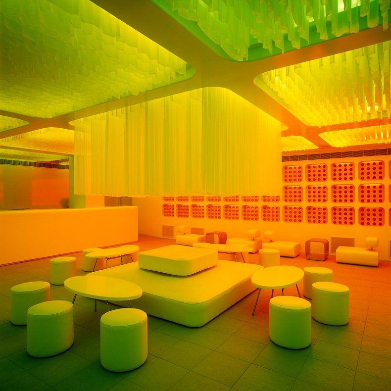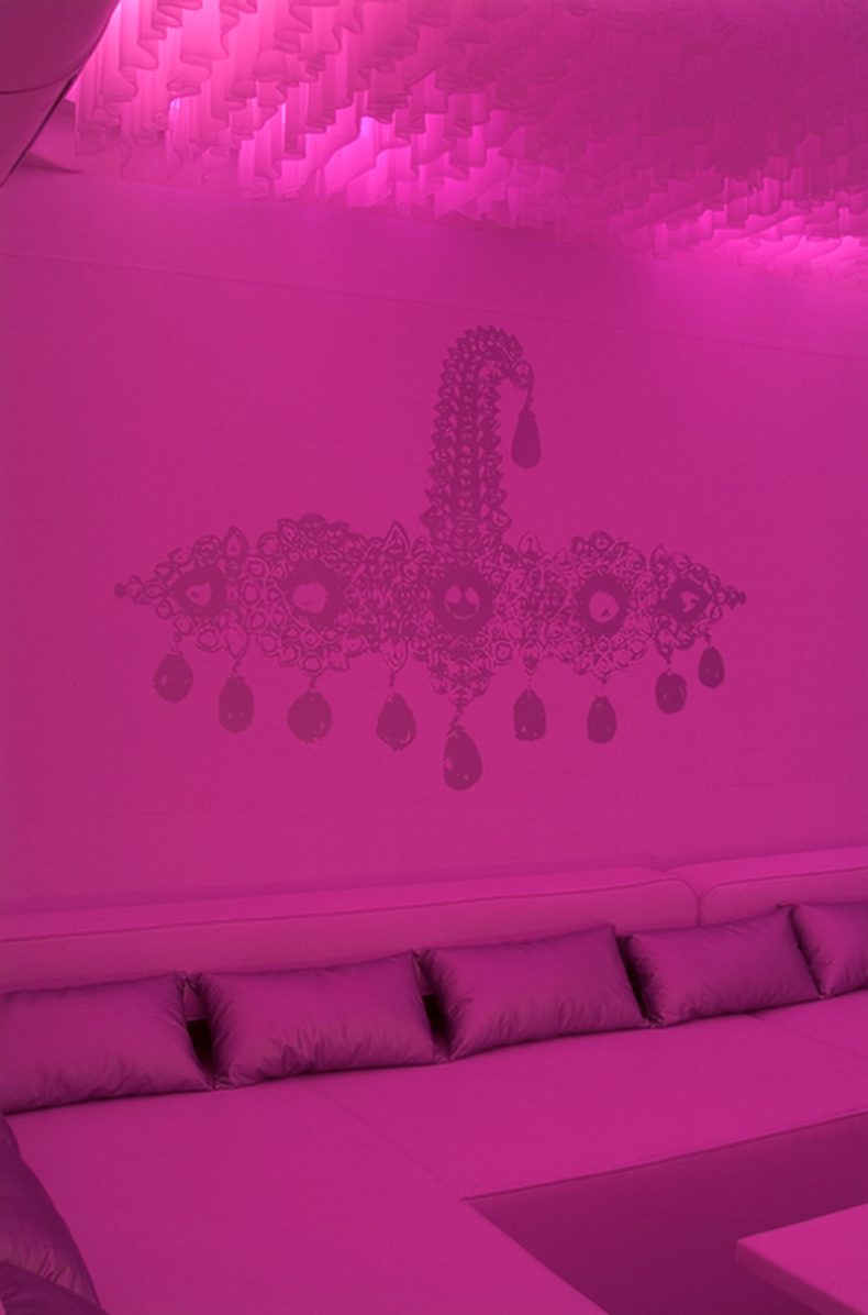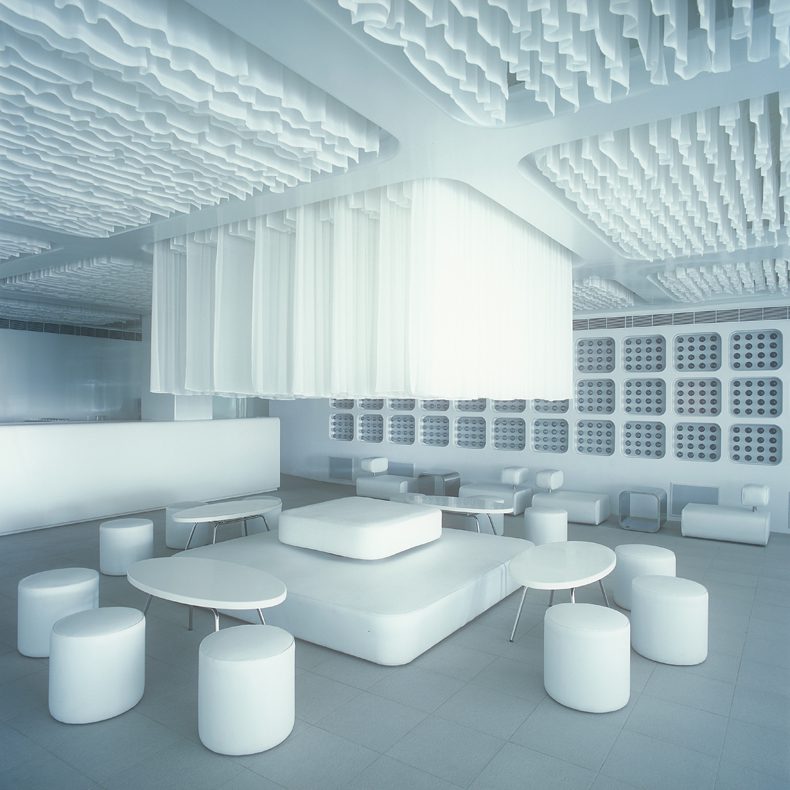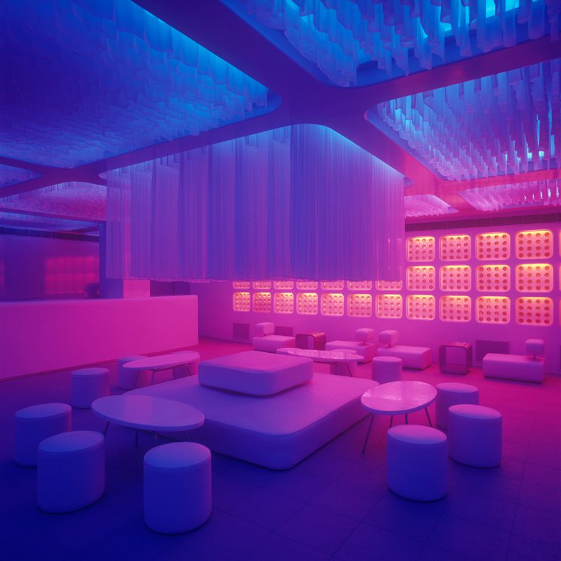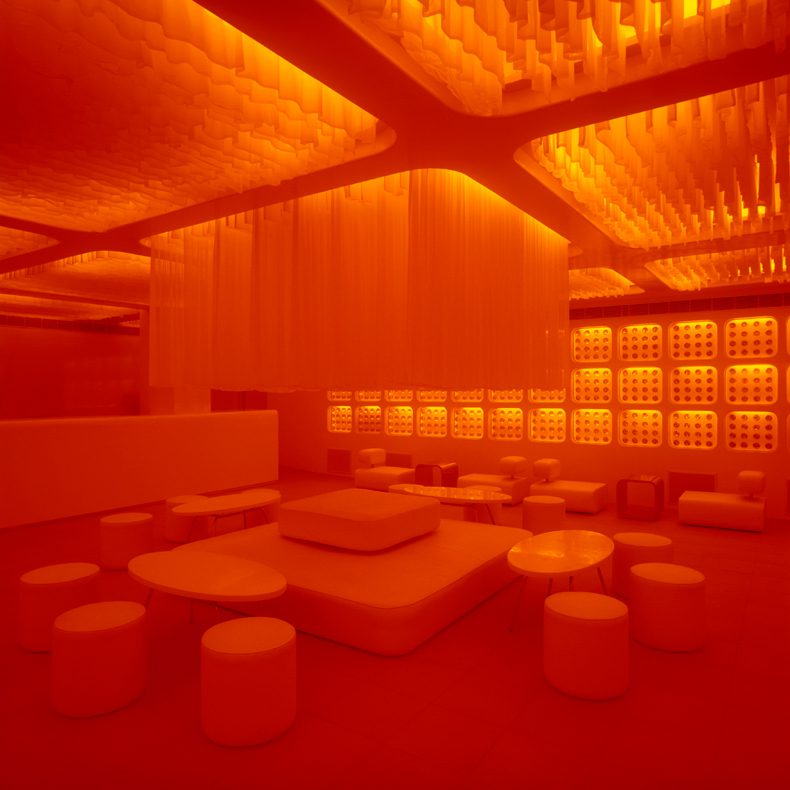 We conceived of the space as a dynamic white shell, that would have the ability to transform itself according to the moods of its users. The LED’s have the ability to change from calm and contemplative colours to more saturated and hyper colours.
