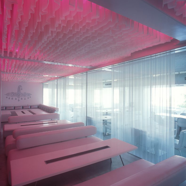 A mundane and particularly uninspiring ceiling with a grid of heavy beams was turned into the most dynamic feature of the space. Rather than close the ceiling with a false ceiling, we suspended thousands of meters of sheer white fabric vertically from the ceiling till the beam bottom. LED lighting was entirely concealed above the folds of fabric within the ceiling, and the preset colours bounce light seductively through the fabric onto the rest of the space.