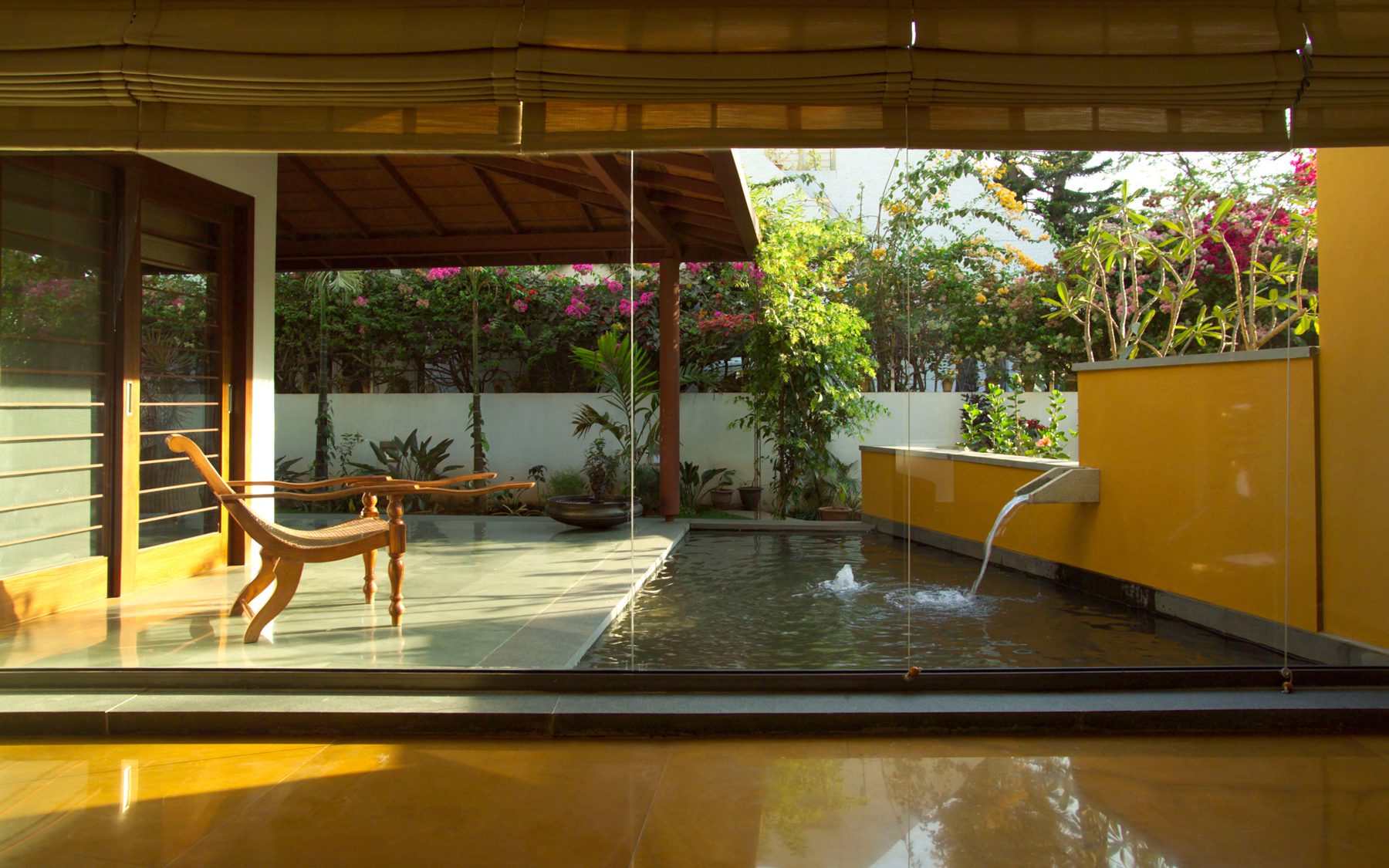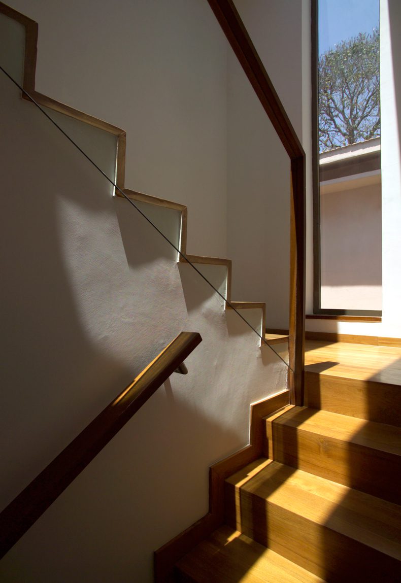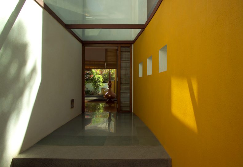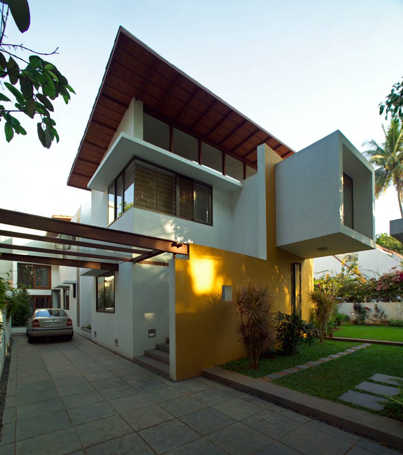 The façade has an interesting juxtaposition and articulation of forms. A 10 ft. cantilevered white cube emerges from a sweeping curved ochre skin wall. The ochre wall hugs the house, rising and stepping down to allow for glimpses of the garden and the huge rain tree across the road. A north light clerestory window with a large Kerala and Mangalore-tiled roof overhang hovers above.