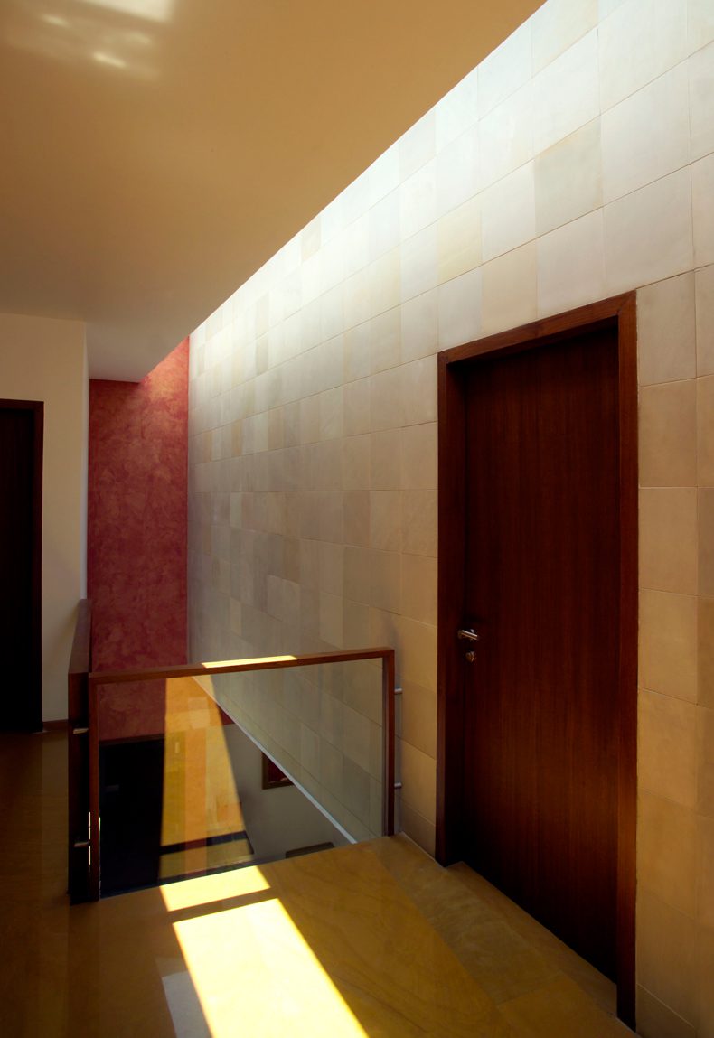A strip of natural light filters through the entire north-south length of the house. Hugging a sandstone-clad skewed wall, the 1 ft. wide skylight bathes the interior volume, penetrating into the ground floor via a large opening in the slab. The double-height volume acts as a visual connector between the two floors. At either end of the skylight are interesting vantage points – a textured magenta wall in the south and a view of the large rain tree via the cantilevered cube in the north.