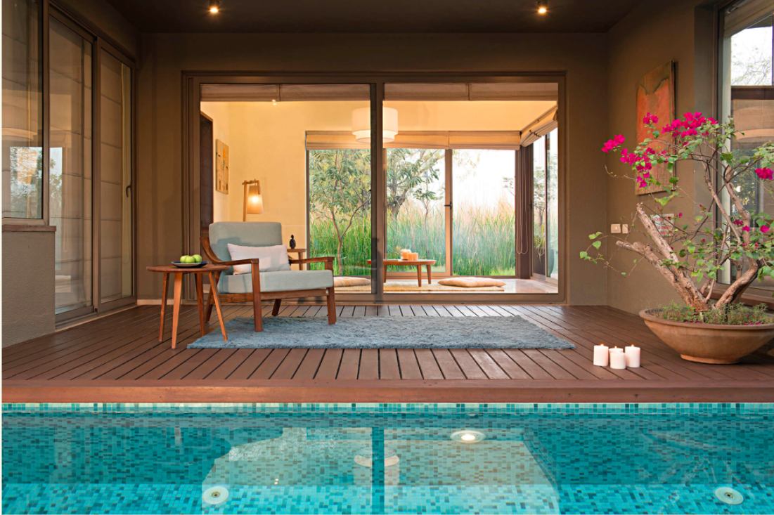The One bedroom villa was the basic configuration out of which all other permutations grew. In this basic plan, the central axis has rooms on either side; kitchen and dining on one side and a bedroom that opens onto a side verandah and a lap pool on the other. The axis culminates in a large living room. The living room opens out into an ample L shaped deck, which spills out into a 1500 sft main garden.