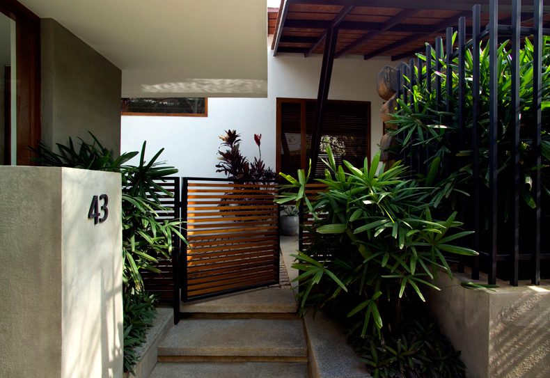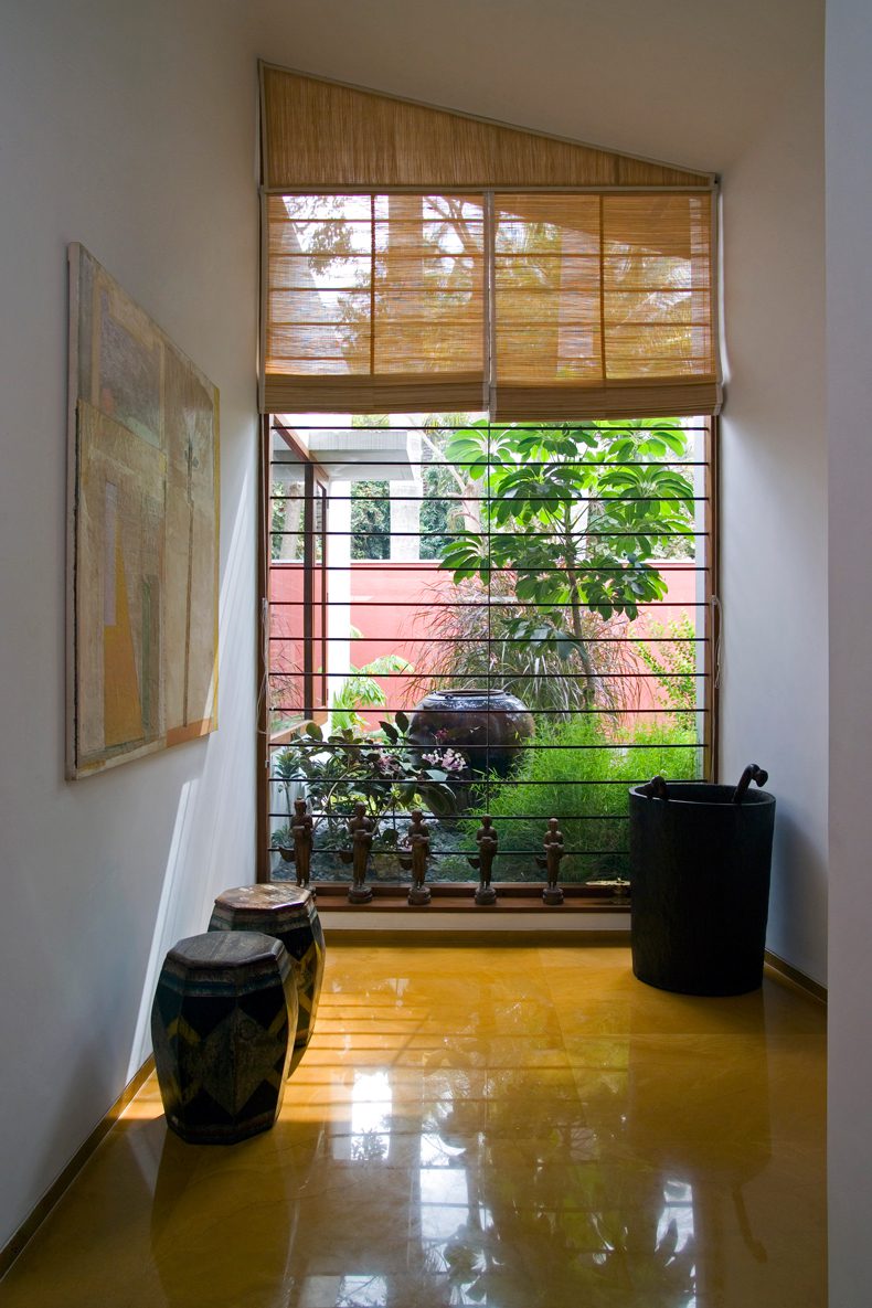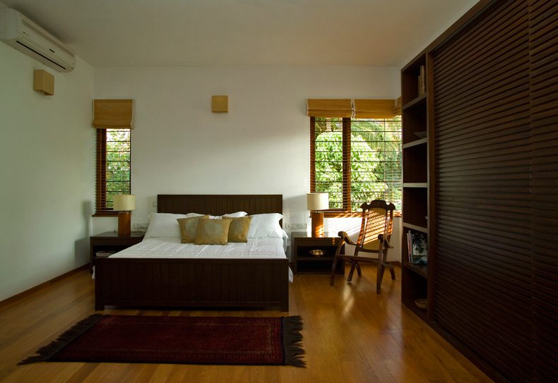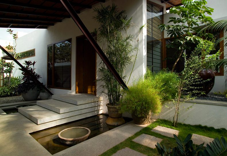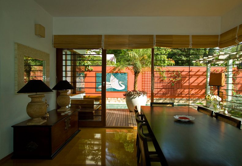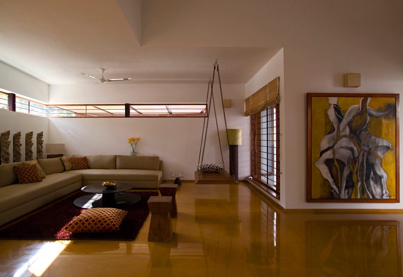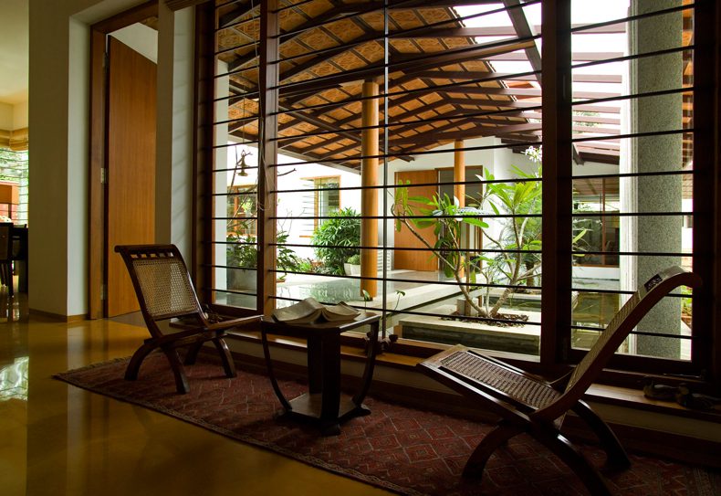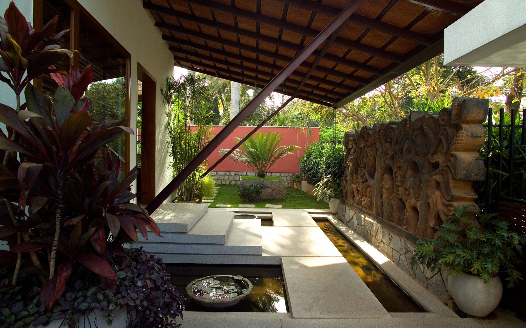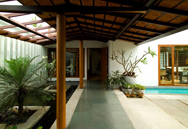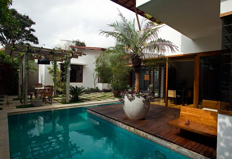 The house draws inspiration from the vernacular architecture of the region – sloped Mangalore tiled roofs with large overhangs define the roof forms, and references to Kerala abound in the choice of interior accessories. An antique Jhoola (swing), oil lamps, colonial chairs from Cochin and the underside Kerala tiled roofs reference the homeowners origins.